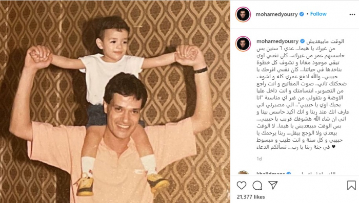 ونشر محمد صورة تجمعهما، عبر حسابه الرسمي بموقع "إنستجرام"، وعلق: "الوقت ما بيعديش من غير هيما، عدى ٦ سنين بس حاسسهم عمر من غيرك، كان نفسي أوي تبقى موجود معانا و تشوف كل خطوة بناخدها في حياتنا، كان نفسي أفرحك يا حبيبي.. والله أدفع عمري كله وأشوف ضحكتك تاني، صوت المفاتيح وإنت راجع من التصوير، ابتسامتك وإنت داخل عليا الأوضة وبتقولي من غير أي مناسبة "أنا بحبك أوي يا حبيبي".