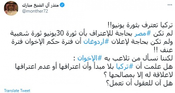 أول تعليق لـ منذر آل الشيخ على اعتراف تركيا بثورة 30 يونيو المصرية