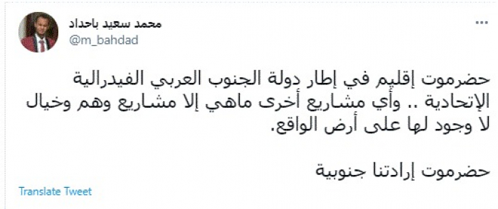 وكتب في تغريدة عبر "تويتر" رصدها "المشهد العربي": "حضرموت إقليم في إطار دولة الجنوب العربي الفيدرالية الإتحادية .. وأي مشاريع أخرى ماهي إلا مشاريع وهم وخيال لا وجود لها على أرض الواقع.