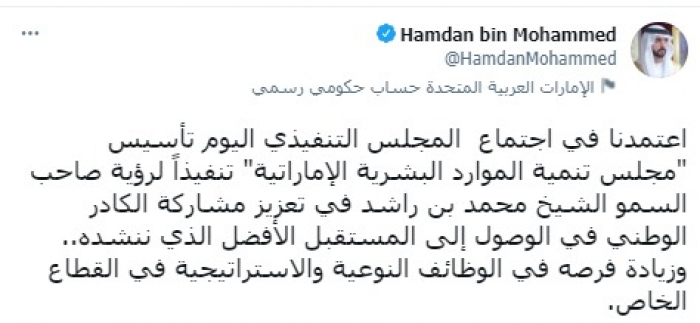 وقال في تغريدة على حسابه بموقع التدوين المصغر تويتر، اليوم إننا: "اعتمدنا في اجتماع المجلس التنفيذي اليوم تأسيس (مجلس تنمية الموارد البشرية الإماراتية)".
