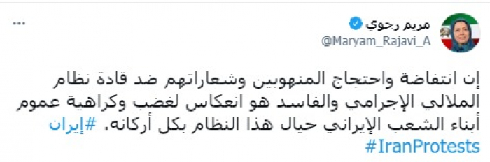وشددت في تغريدة على حسابها بموقع التدوين المصغر تويتر، اليوم على أن: "انتفاضة واحتجاج المنهوبين وشعاراتهم ضد قادة نظام الملالي الإجرامي والفاسد هو انعكاس لغضب وكراهية عموم أبناء الشعب الإيراني حيال هذا النظام بكل أركانه".