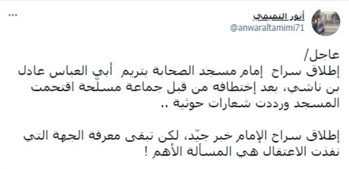 وكشف في تغريدة على حسابه بموقع التدوين المصغر تويتر، اليوم عن: "إطلاق سراح إمام مسجد الصحابة بتريم أبي العباس عادل بن ناشي، بعد اختطافه من قبل جماعة مسلّحة اقتحمت المسجد ورددت شعارات حوثية".