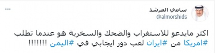 وقال في تغريدة على حسابه بموقع التدوين المصغر تويتر، اليوم إن: "أكثر ما يدعو للاستغراب والضحك والسخرية هو عندما تطلب أمريكا من إيران لعب دور إيجابي في اليمن".