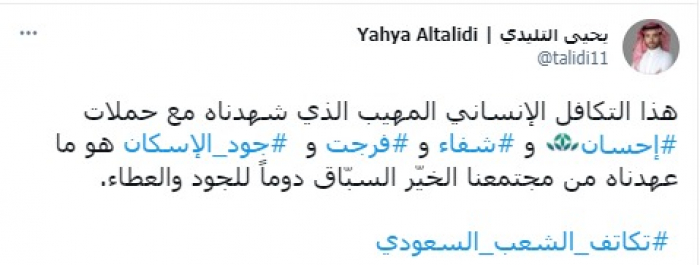 وأوضح في تغريدة على حسابه بموقع التدوين المصغر تويتر، اليوم أن: "هذا التكافل الإنساني المهيب الذي شهدناه مع حملات إحسان وشفاء وفرجت وجود الإسكان، هو ما عهدناه من مجتمعنا الخيّر السبّاق دوماً للجود والعطاء"، مختتما بهاشتاج: "تكاتف الشعب السعودي".