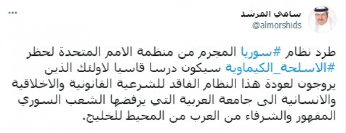 وأوضح في تغريدة على حسابه بموقع التدوين المصغر تويتر، اليوم أن: "طرد نظام سوريا المجرم من منظمة الأمم المتحدة لحظر الأسلحة الكيماوية سيكون درسا قاسيا لأولئك الذين يروجون لعودة هذا النظام الفاقد للشرعية القانونية والأخلاقية والإنسانية إلى الجامعة العربية".