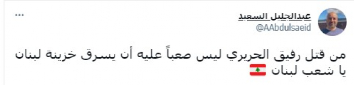 وأكد في تغريدة على حسابه بموقع التدوين المصغر تويتر، اليوم أن: "من قتل رفيق الحريري ليس صعباً عليه أن يسرق خزينة لبنان يا شعب لبنان"، في إشارة إلى مليشيات حزب الله الموالية لنظام ملالي طهران.