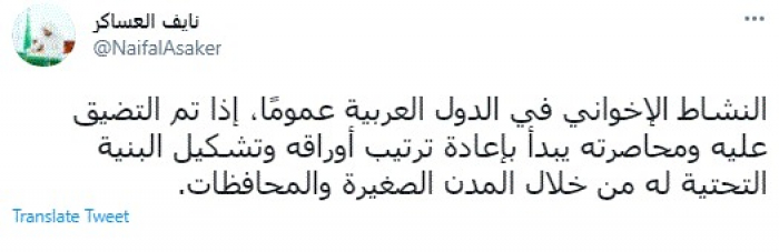 وقال في تغريدة عبر "تويتر" رصدها "المشهد العربي": "النشاط الإخواني في الدول العربية عمومًا، إذا تم التضيق عليه ومحاصرته يبدأ بإعادة ترتيب أوراقه وتشكيل البنية التحتية له من خلال المدن الصغيرة والمحافظات".