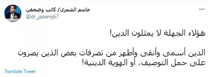 وقال في تغريدة عبر "تويتر" رصدها "المشهد العربي": "هؤلاء الجهلة لا يمثلون الدين.. الدين أسمى وأنقى وأطهر من تصرفات بعض الذين يصرون على حمل التوصيف، أو الهوية الدينية".