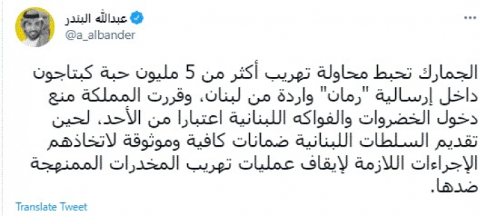 وقال في تغريدة عبر "تويتر" رصدها "المشهد العربي": "الجمارك تحبط محاولة تهريب أكثر من 5 مليون حبة كبتاجون داخل إرسالية رمان واردة من لبنان، وقررت المملكة منع دخول الخضروات والفواكه اللبنانية اعتبارا من الأحد، لحين تقديم السلطات اللبنانية ضمانات كافية وموثوقة لاتخاذهم الإجراءات اللازمة لإيقاف عمليات تهريب المخدرات الممنهجة ضدها".