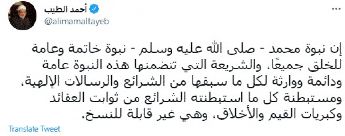 وكتب في تغريدة عبر "تويتر" رصدها "المشهد العربي": "إن نبوة محمد - صلى الله عليه وسلم - نبوة خاتمة وعامة للخلق جميعًا، والشريعة التي تتضمنها هذه النبوة عامة ودائمة ووارثة لكل ما سبقها من الشرائع والرسالات الإلهية، ومستبطنة كل ما استبطنته الشرائع من ثوابت العقائد وكبريات القيم والأخلاق، وهي غير قابلة للنسخ".