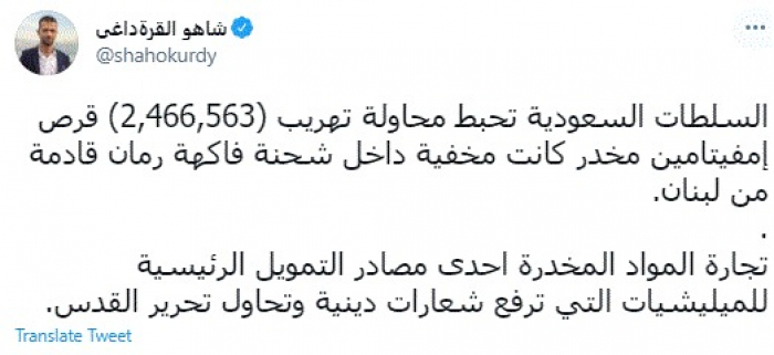 وكتب في تغريدة عبر "تويتر" رصدها "المشهد العربي": "السلطات السعودية تحبط محاولة تهريب (2,466,563) قرص إمفيتامين مخدر كانت مخفية داخل شحنة فاكهة رمان قادمة من لبنان. تجارة المواد المخدرة إحدى مصادر التمويل الرئيسية للميليشيات التي ترفع شعارات دينية وتحاول تحرير القدس".