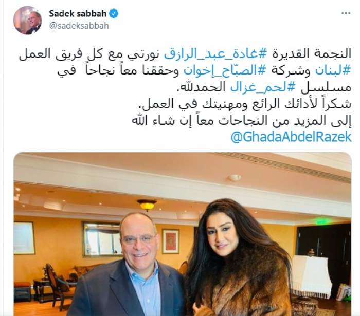 وكتب الصباح، عبر حسابه على تويتر : "النجمة القديرة غادة عبد الرازق.. نورتي مع كل فريق العمل، لبنان وشركة الصباح إخوان، وحققنا معاً نجاحاً في مسلسل( لحم غزال)، الحمدلله".