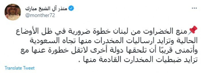 وكتب في تغريدة عبر "تويتر" رصدها "المشهد العربي": "منع الخضراوت من لبنان خطوة ضرورية في ظل الأوضاع الحالية وتزايد ارساليات المخدرات منها تجاه السعودية وأتمنى قريبًا أن تلحقها دولة أخرى لاتقل خطورة عنها مع تزايد ضبطيات المخدارت القادمة منها".