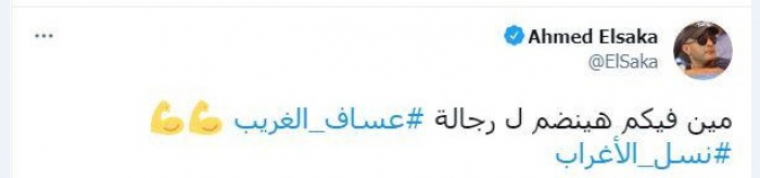 غرد الفنان أحمد السقا حول مسلسل "نسل الأغراب"، عبر حسابه بموقع "تويتر"، موجهًا رسالة إلى جمهوره قائلًا: "مين فيكم هينضم لـ رجالة عساف الغريب؟".