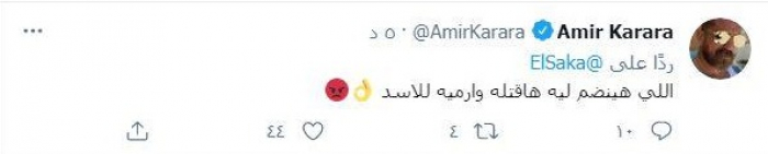 ليرد الفنان أمير كرارة على تغريدة السقا، متوعدًا كل من ينضم إليه، قائلًا: "اللي هينضم ليه هقتله وأرميه للأسد".