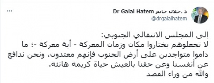 وقال في تغريدة على حسابه بموقع التدوين المصغر تويتر، اليوم: "إلى المجلس الانتقالي الجنوبي: لا تجعلوهم يختارون مكان وزمان المعركة - أية معركة -؛ ما داموا متواجدين على أرض الجنوب".