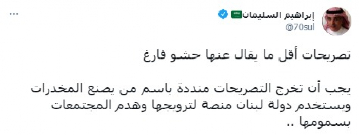 وأضاف أنه: "يجب أن تخرج التصريحات منددة باسم من يصنع المخدرات ويستخدم دولة لبنان منصة لترويجها وهدم المجتمعات بسمومها"، في إشارة لمليشيات حزب الله.