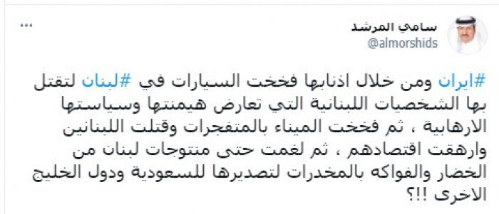 وقال في تغريدة على حسابه بموقع التدوين المصغر تويتر، اليوم إن: "إيران ومن خلال أذنابها فخخت السيارات في لبنان لتقتل بها الشخصيات اللبنانية التي تعارض هيمنتها وسياستها الإرهابية".