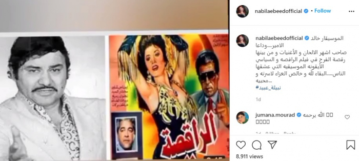وكتبت عبيد، عبر حسابها على إنستجرام :"الموسيقار خالد الأمير.. وداعا صاحب أشهر الألحان والأغنيات ومن بينها رقصة الفرح في فيلم الراقصة والسياسي.. الأيقونة الموسيقية التي عشقها الناس.. البقاء لله وخالص العزاء لأسرته ومحبيه".