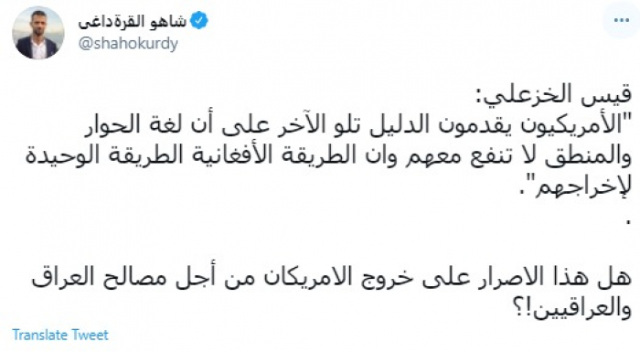 علق الكاتب الصحفي العراقي شاهو القرةداغي، اليوم، على إصرار الأمين العام لعصائب أهل الحق قيس الخزعلي، لإخراج القوات الأمريكية من العراق.