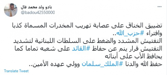 أشاد الكاتب الصحفي الموريتاني بادو ولد محمد فال، اليوم، بالقرارات السعودية الجديدة لوقف محاولات حزب الله الفاشلة لتهريب المخدرات داخل المملكة.