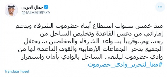 وكتب في تغريدة عبر "تويتر" رصدها "المشهد العربي": "منذ خمس سنوات استطاع أبناء حضرموت الشرفاء وبدعم إماراتي من دعس القاعدة وتخليص الساحل من رجسهم".