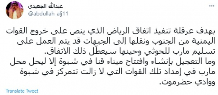حذر الشاعر عبدالله الجعيدي، اليوم، من مخطط تسليم مأرب لمليشيات الحوثي الإرهابية بهدف تعطيل تنفيذ اتفاق الرياض، مؤكدًا أن التعجل في افتتاح ميناء قنا بشبوة هدفه إمداد القوات المتمركزة في شبوة ووادي حضرموت ليحل محل مأرب.