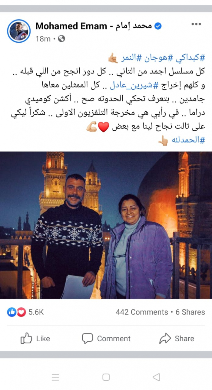 ونشر إمام، صورة له معها عبر حسابه على فيس بوك، وعلق :"كبداكي، هوجان، النمر.. كل مسلسل أجمد من التاني.. كل دور أنجح من اللي قبله، وكلهم إخراج شيرين عادل ".