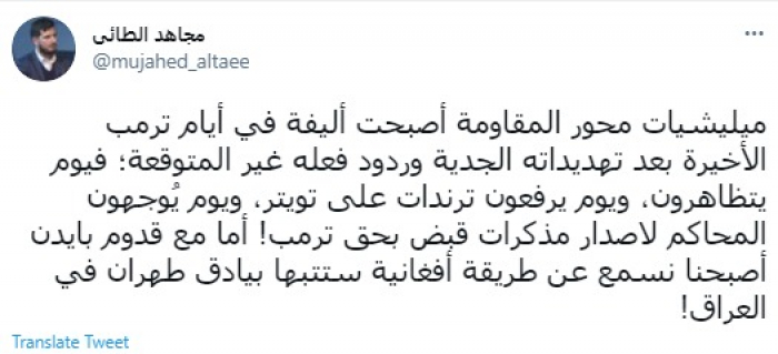 وقال في تغريدة عبر "تويتر" رصدها "المشهد العربي": "مليشيات محور المقاومة أصبحت أليفة في أيام ترمب الأخيرة بعد تهديداته الجدية وردود فعله غير المتوقعة؛ فيوم يتظاهرون، ويوم يرفعون تريندات على تويتر، ويوم يُوجهون المحاكم لإصدار مذكرات قبض بحق ترمب".