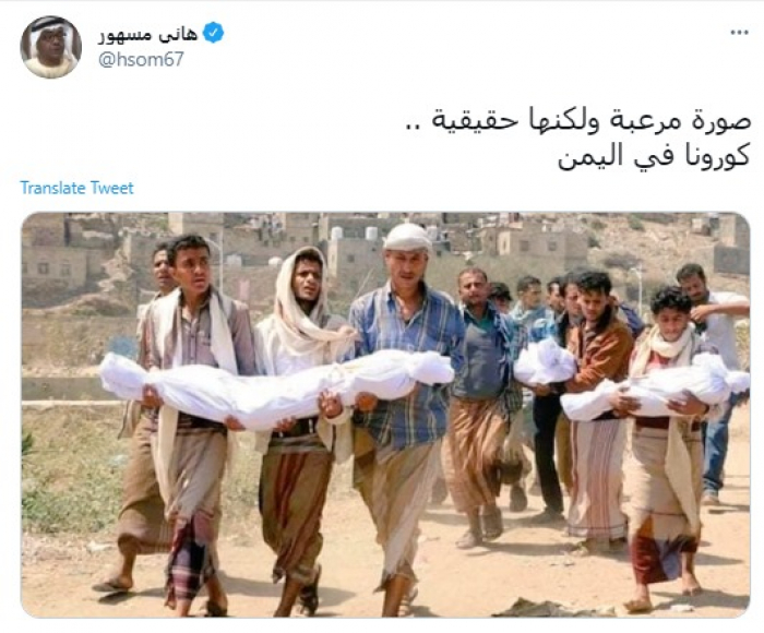 وقال في تغريدة عبر "تويتر" رصدها "المشهد العربي": " صورة مرعبة ولكنها حقيقية كورونا في اليمن".