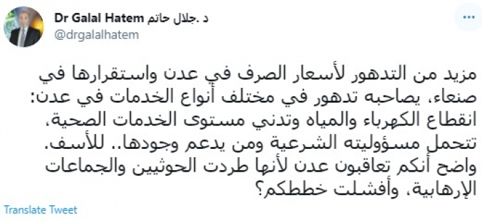 وكتب في تغريدة عبر "تويتر" رصدها "المشهد العربي": " مزيد من التدهور لأسعار الصرف في عدن واستقرارها في صنعاء، يصاحبه تدهور في مختلف أنواع الخدمات في عدن: انقطاع الكهرباء والمياه وتدني مستوى الخدمات الصحية، تتحمل مسؤوليته الشرعية ومن يدعم وجودها.. للأسف".