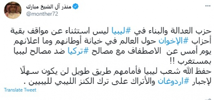 حذر المدون السعودي البارز منذر آل الشيخ مبارك، اليوم، من عمالة حزب العدالة والبناء في ليبيا لصالح مخططات تركيا.