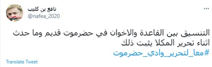 وكتب في تغريدة عبر "تويتر" رصدها "المشهد العربي": "التنسيق بين القاعدة والإخوان في حضرموت قديم وما حدث اثناء تحرير المكلا يثبت ذلك معا لتحرير وادي حضرموت".