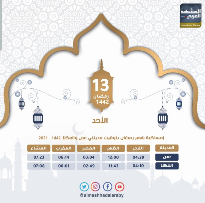 ينشر "المشهد العربي" لقرائه مواعيد أذاني الفجر والمغرب، بالعاصمة عدن ومدينة المكلا اليوم الأحد، الموافق 13 رمضان.