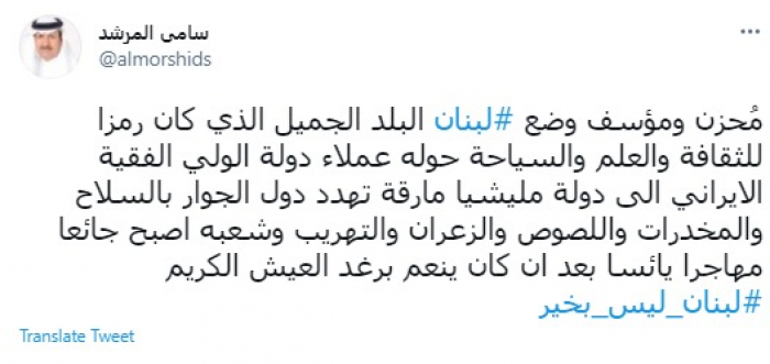 وقال في تغريدة عبر "تويتر" رصدها "المشهد العربي": "مُحزن ومؤسف وضع لبنان البلد الجميل الذي كان رمزًا للثقافة والعلم والسياحة حوله عملاء دولة الولي الفقية الإيراني إلى دولة مليشيا مارقة تهدد دول الجوار بالسلاح والمخدرات واللصوص والزعران والتهريب وشعبه أصبح جائعا مهاجرا يائسا بعد أن كان ينعم برغد العيش الكريم".