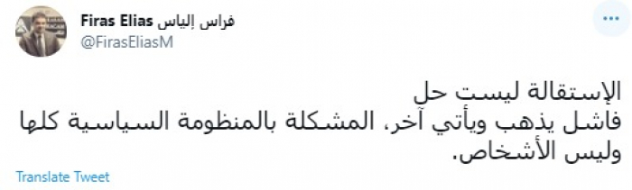 وقال في تغريدة عبر "تويتر" رصدها "المشهد العربي": " الإستقالة ليست حل فاشل يذهب ويأتي آخر، المشكلة بالمنظومة السياسية كلها وليس الأشخاص".