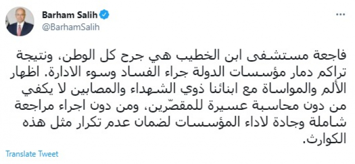 علق الرئيس العراقي برهم صالح، اليوم، على مجزرة مستشفى ابن الخطيب، مؤكدًا أن الحادث جرح لكل الوطن، مشددًا على أن ذلك جاء نتيجة تراكم دمار مؤسسات الدولة جراء الفساد وسوء الإدارة.