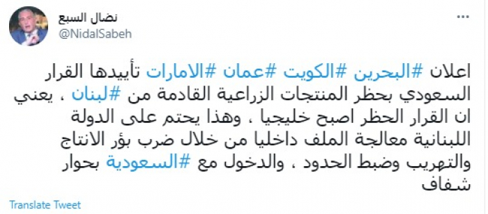 وقال في تغريدة عبر "تويتر" رصدها "المشهد العربي": "إعلان البحرين الكويت عمان الإمارات تأييدها القرار السعودي بحظر المنتجات الزراعية القادمة من لبنان ، يعني أن القرار الحظر أصبح خليجيا".