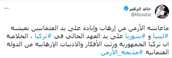 أكد المحلل السياسي السعودي خالد الزعتر، أن مآسي الأرمن في عهد الدولة العثمانية، تتكرر على يد الأتراك في ليبيا وسوريا.