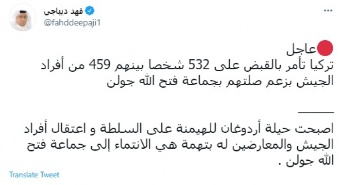 وقال في تغريدة عبر "تويتر" رصدها "المشهد العربي": "تركيا تأمر بالقبض على 532 شخصا بينهم 459 من أفراد الجيش بزعم صلتهم بجماعة فتح الله جولن.. أصبحت حيلة أردوغان للهيمنة على السلطة واعتقال أفراد الجيش والمعارضين له بتهمة هي الانتماء إلى جماعة فتح الله جولن".