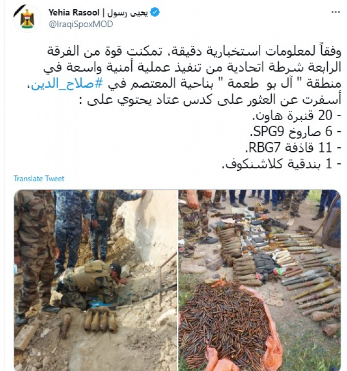 وقال في تغريدة عبر "تويتر" رصدها "المشهد العربي": "وفقاً لمعلومات استخبارية دقيقة، تمكنت قوة من الفرقة الرابعة شرطة اتحادية من تنفيذ عملية أمنية واسعة في منطقة آل بو طعمة بناحية المعتصم في صلاح الدين، أسفرت عن العثور على كدس عتاد يحتوي على: 20 قنبرة هاون - 6 صاروخ SPG9 - 11 قاذفة RBG7 - 1 بندقية كلاشنكوف".