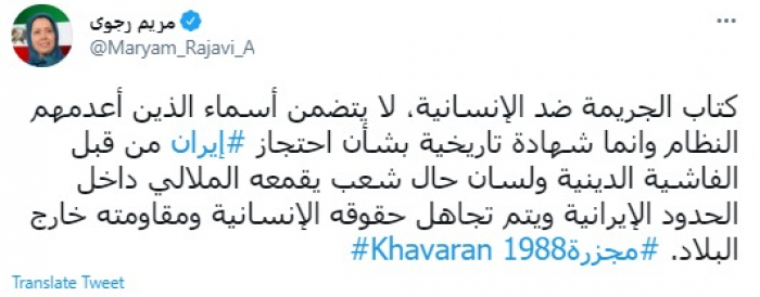 وكتبت في تغريدة عبر "تويتر" رصدها "المشهد العربي": "كتاب الجريمة ضد الإنسانية، لا يتضمن أسماء الذين أعدمهم النظام وانما شهادة تاريخية بشأن احتجاز إيران من قبل الفاشية الدينية ولسان حال شعب يقمعه الملالي داخل الحدود الإيرانية ويتم تجاهل حقوقه الإنسانية ومقاومته خارج البلاد. مجزرة 1988".