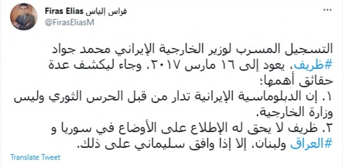 وقال في تغريدة عبر "تويتر" رصدها "المشهد العربي": "التسجيل المسرب لوزير الخارجية الإيراني محمد جواد ظريف، يعود إلى ١٦ مارس ٢٠١٧، وجاء ليكشف عدة حقائق أهمها؛ إن الدبلوماسية الإيرانية تدار من قبل الحرس الثوري وليس وزارة الخارجية".