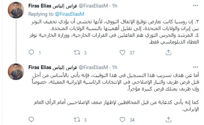 وأضاف: "ظريف لا يحق له الإطلاع على الأوضاع في سوريا و #العراق ولبنان، إلا إذا وافق سليماني على ذلك. إن روسيا كانت تعارض توقيع الإتفاق النووي، لأنها تخشى أن يؤدي تخفيف التوتر بين إيران والولايات المتحدة، إلى تقليل أهميتها بالنسبة الولايات المتحدة".