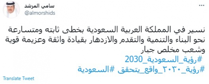 وكتب في تغريدة عبر "تويتر" رصدها "المشهد العربي": "نسير في المملكة العربية السعودية بخطى ثابته ومتسارعة نحو البناء والتنمية والتقدم والازدهار بقيادة واثقة وعزيمة قوية وشعب مخلص جبار.. رؤية السعودية 2030".