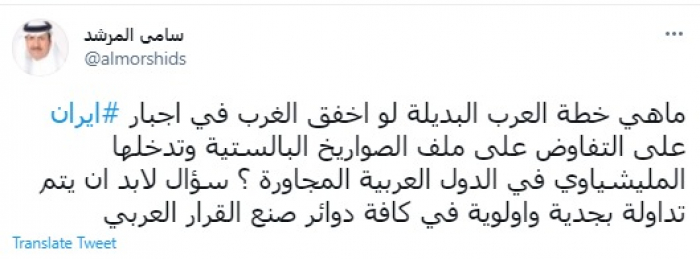 وقال في تغريدة عبر "تويتر" رصدها "المشهد العربي": "ما هي خطة العرب البديلة لو أخفق الغرب في إجبار إيران على التفاوض على ملف الصواريخ البالستية وتدخلها المليشياوي في الدول العربية المجاورة ؟ سؤال لا بد أن يتم تداولة بجدية وأولوية في كافة دوائر صنع القرار العربي".