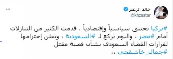واعتبر في تغريدة على حسابه بموقع التدوين المصغر تويتر، اليوم أن: "تركيا تختنق سياسيا واقتصاديا، قدمت الكثير من التنازلات أمام مصر".