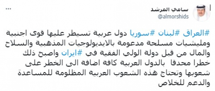 وقال في تغريدة على حسابه بموقع التدوين المصغر تويتر، اليوم إن: "العراق ولبنان وسوريا دول عربية تسيطر عليها قوى أجنبية ومليشيات مسلحة مدعومة بالأيديولوجيات المذهبية والسلاح والمال من قبل دولة الولي الفقيه في إيران".