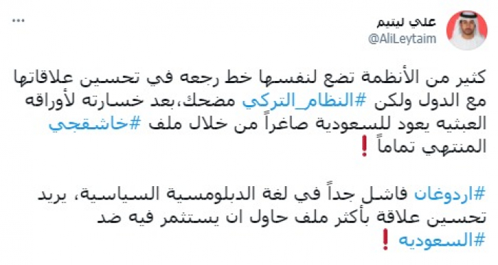 رأى الكاتب الصحفي علي ليتيم، أن الرئيس التركي رجب طيب أردوغان فاشل في لغة الدبلوماسية، معتبرا أن تركيا تحاول العودة صاغرة إلى السعودية.