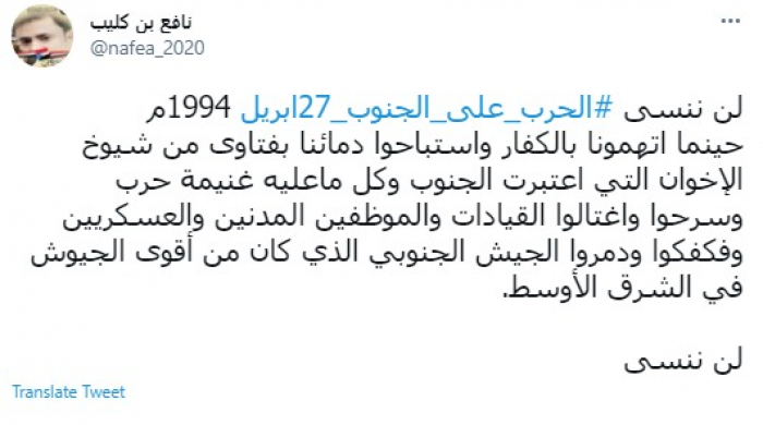 وكتب في تغريدة عبر "تويتر" رصدها "المشهد العربي": "لن ننسى الحرب على الجنوب 27 إبريل 1994م.. حينما اتهمونا بالكفار واستباحوا دمائنا بفتاوى من شيوخ الإخوان التي اعتبرت الجنوب وكل ما عليه غنيمة حرب".